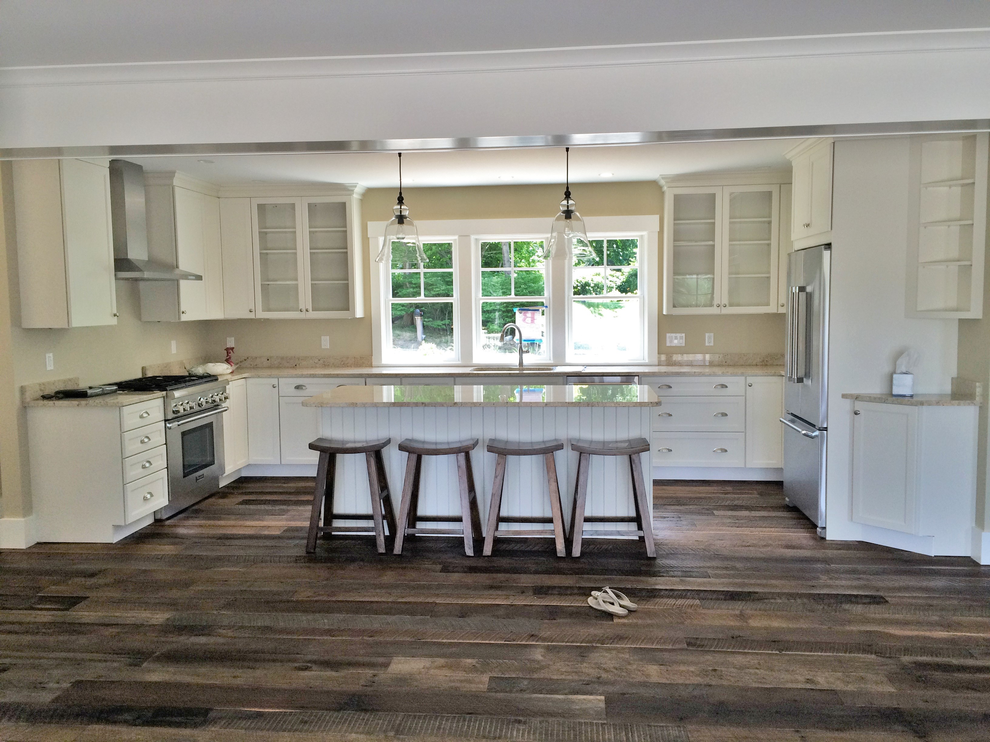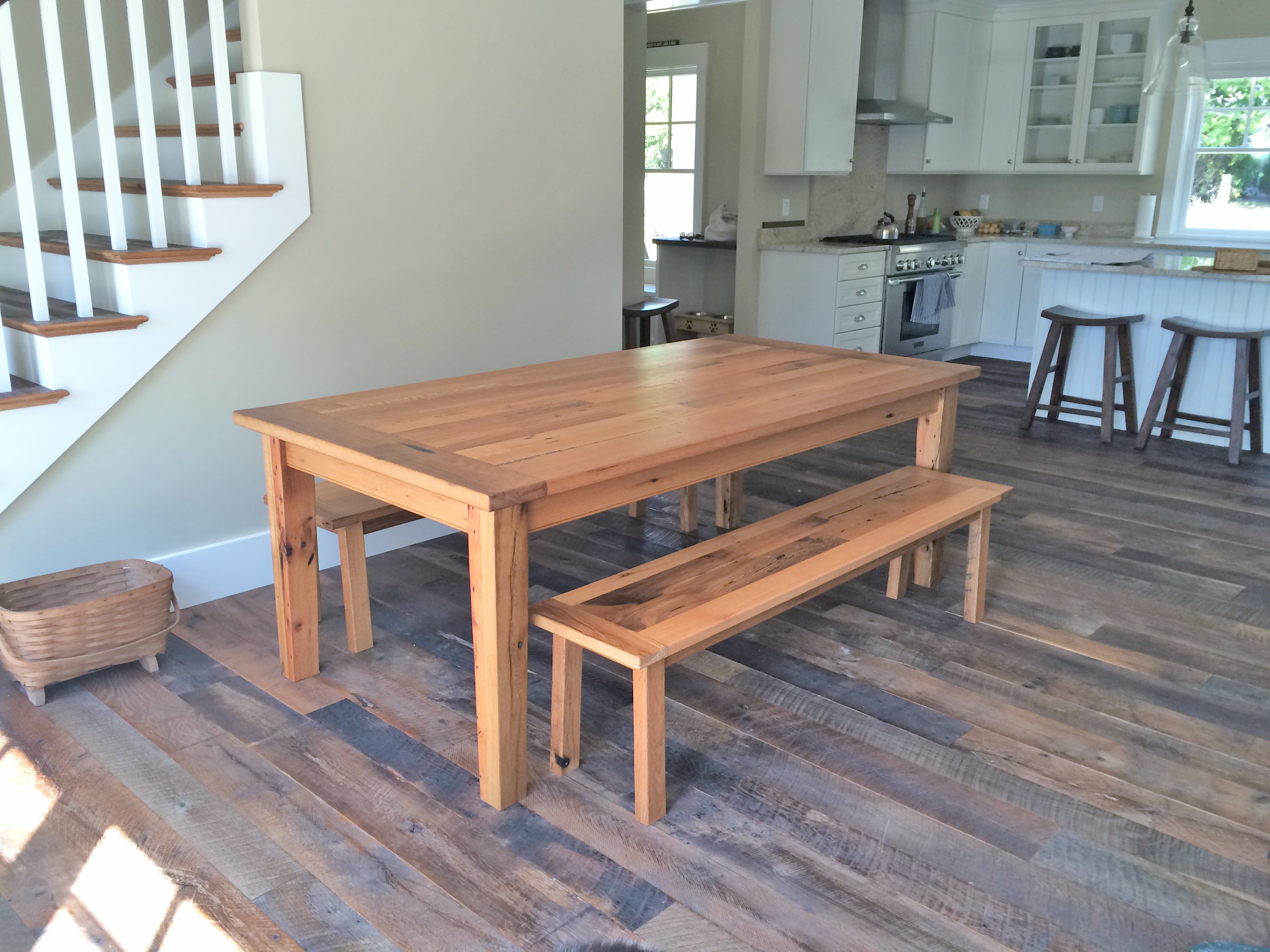 This Kitchen Island looks beautiful surrounded by the Reclaimed Kendall Road Flooring.