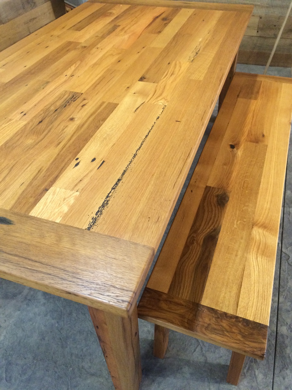 Pictured one of our custom made Reclaimed Oak Dining tables with two matching benches.