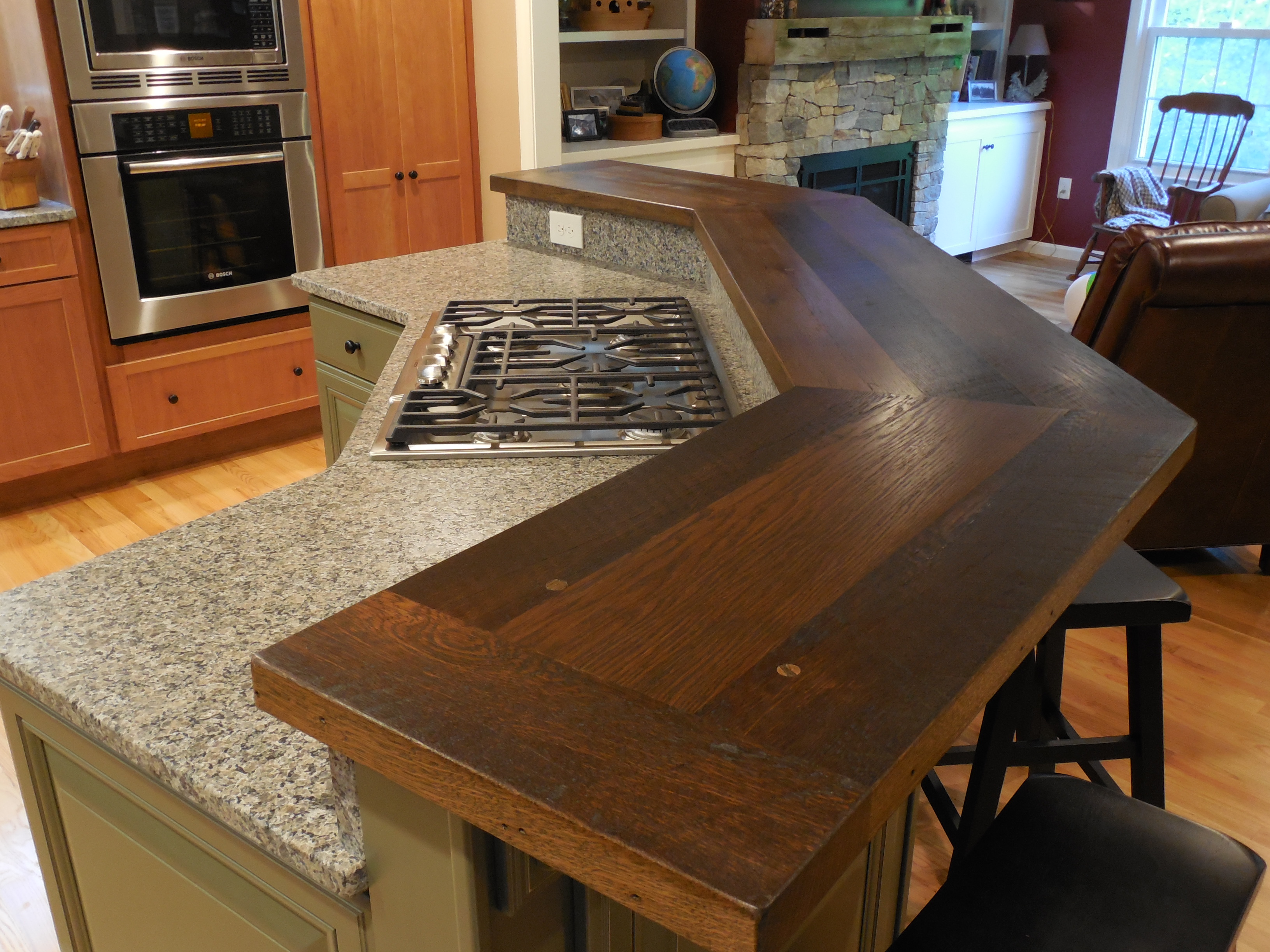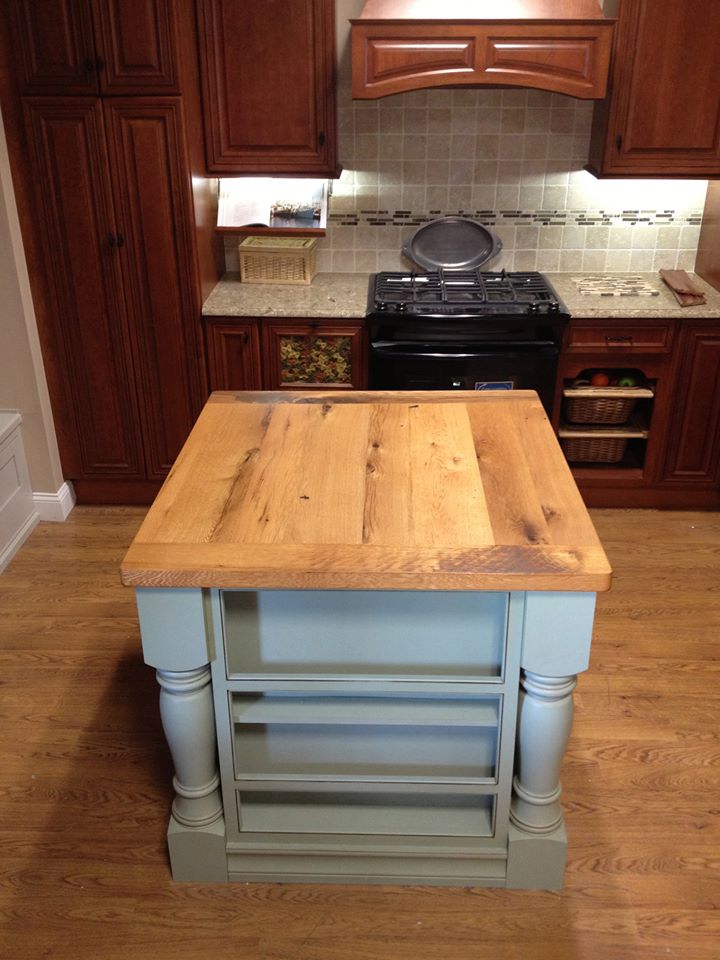 Reclaimed Oak Elevated Island top stained and finished with tung oil