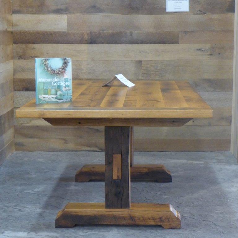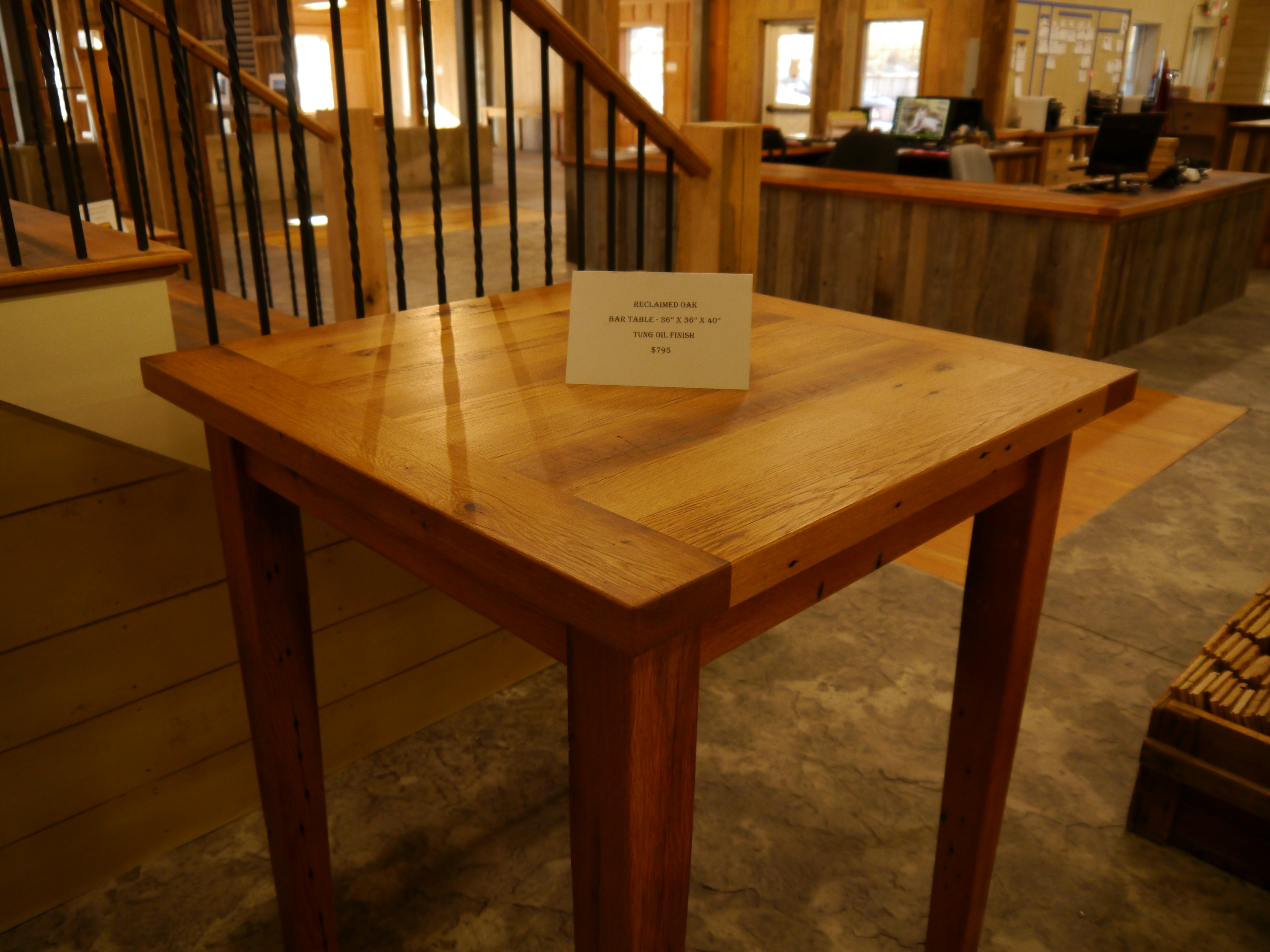 This bar height table is made from reclaimed oak finished with a tung oil finish.