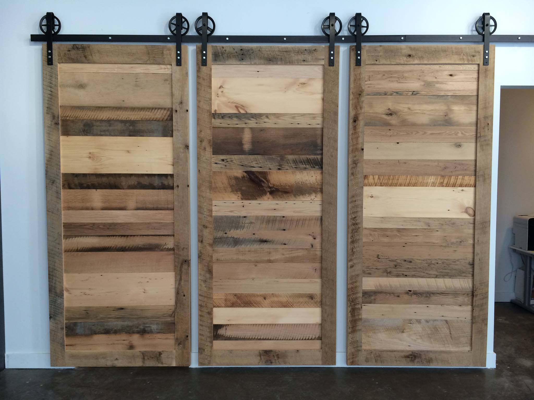 This trio of reclaimed sliding barn doors show the range of color variation in the barnboard material.