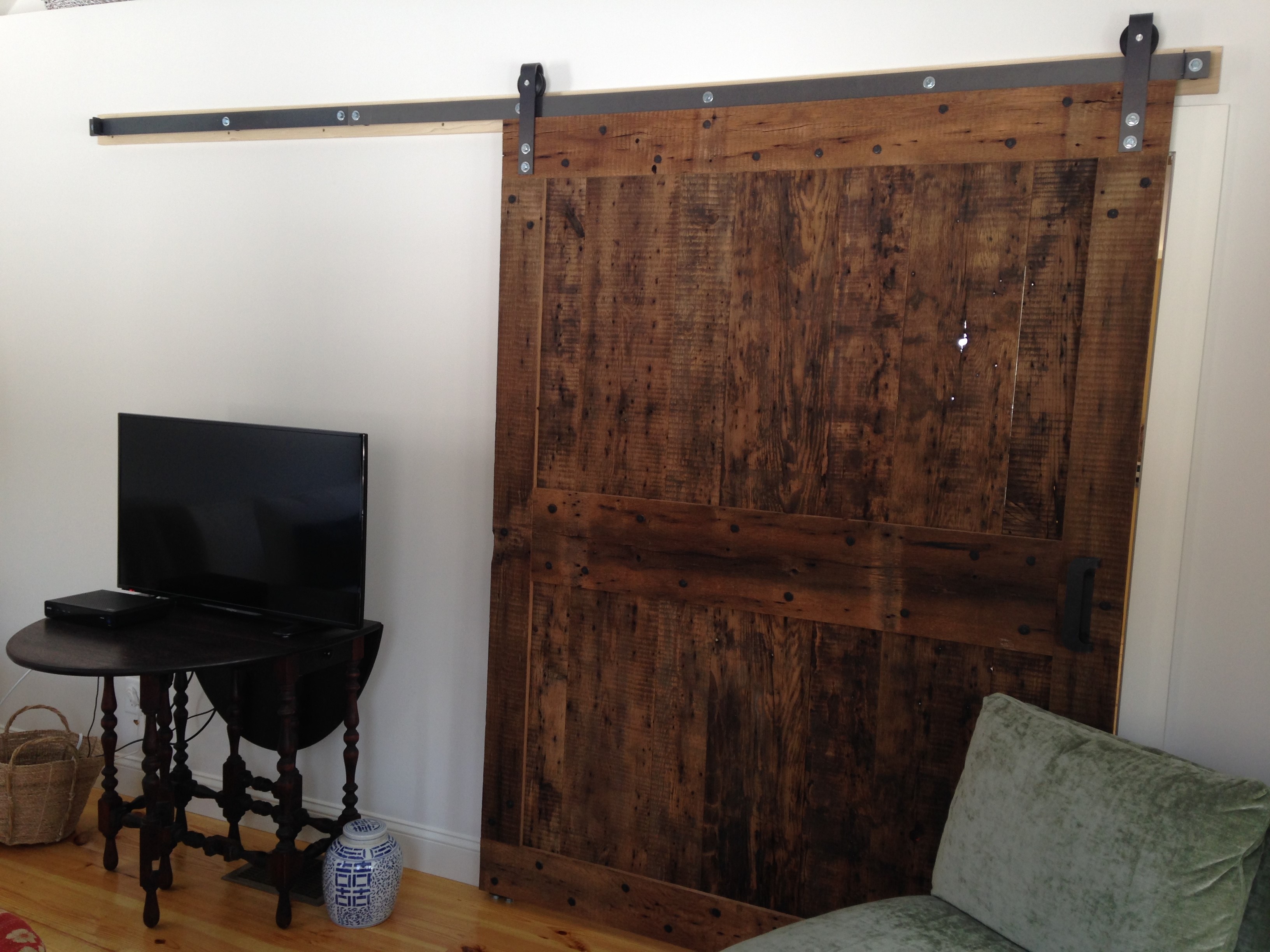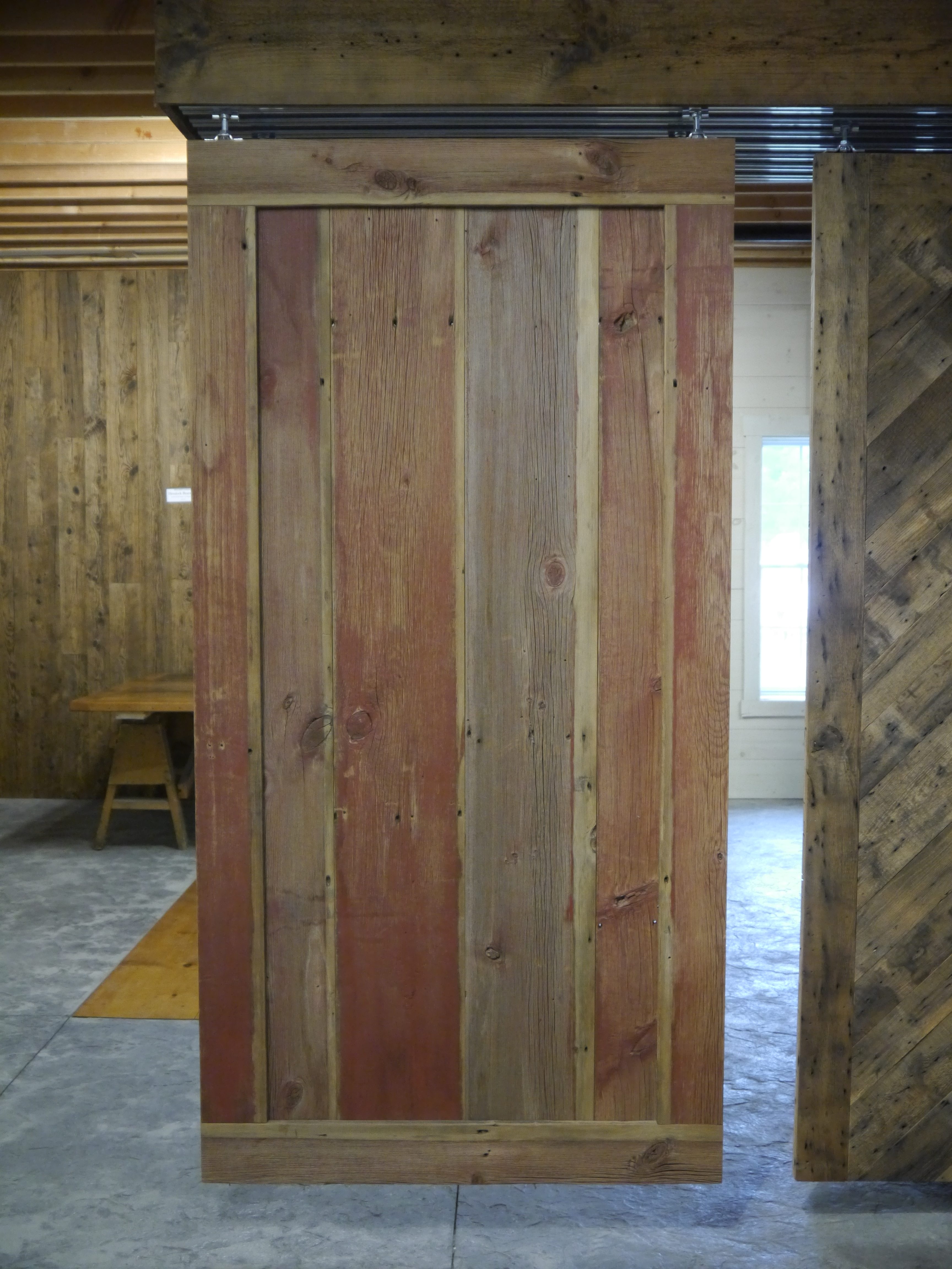 This sliding barn door is made of reclaimed roofboard material for a rustic appearance.