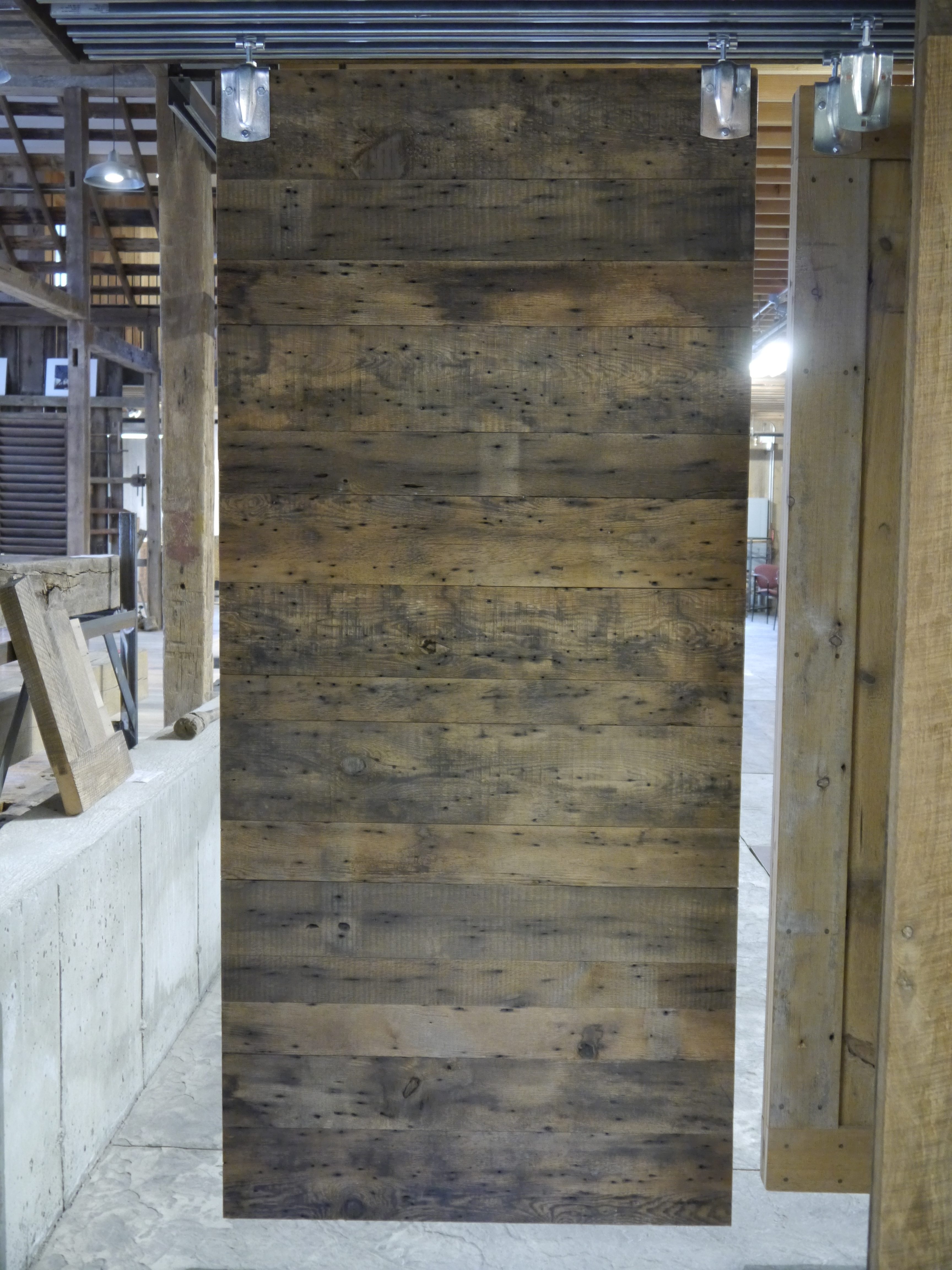 By mixing species this reclaimed sliding barn door blends the unique grain pattern and coloring of both the brown barnboard and the reclaimed roofboard materials.